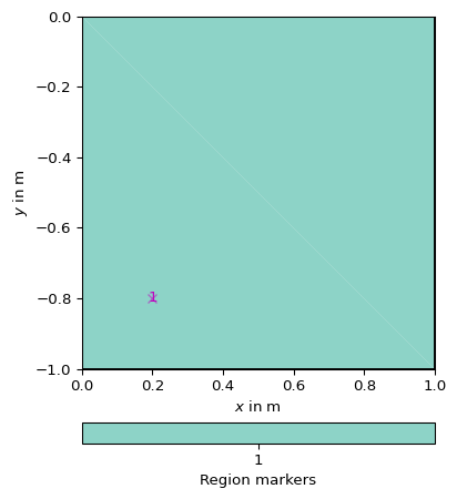 Nodethen fixed values for single node indices can by be given. e.g., bc={‘Node’: [nodeID, value]}. Note this is only a shortcut for bc={‘Dirichlet’: [mesh.node(nodeID), value]}.The parameter a for Neumann boundary condition is chosen automatically from the diffusivity parameter a of the associated cell.