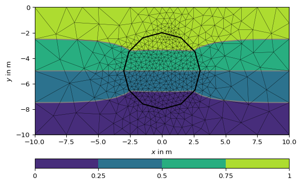 >>> # no need to import matplotlib, pygimli show does. >>> import pygimli as pg >>> import pygimli.meshtools as mt >>> world = mt.createWorld(start=[-10, 0], end=[10, -10], ... marker=1, worldMarker=False) >>> c1 = mt.createCircle(pos=[0.0, -5.0], radius=3.0, area=.1, marker=2) >>> mesh = mt.createMesh([world, c1], quality=34.3) >>> u = pg.solver.solveFiniteElements(mesh, a={1: 100.0, 2: 1.0}, ... bc={'Dirichlet':{4: 1.0, 3: 0.0}}) >>> ax = pg.show(mesh, u, showMesh=True)[0] >>> _ = pg.show(c1, ax=ax, fillRegion=False)